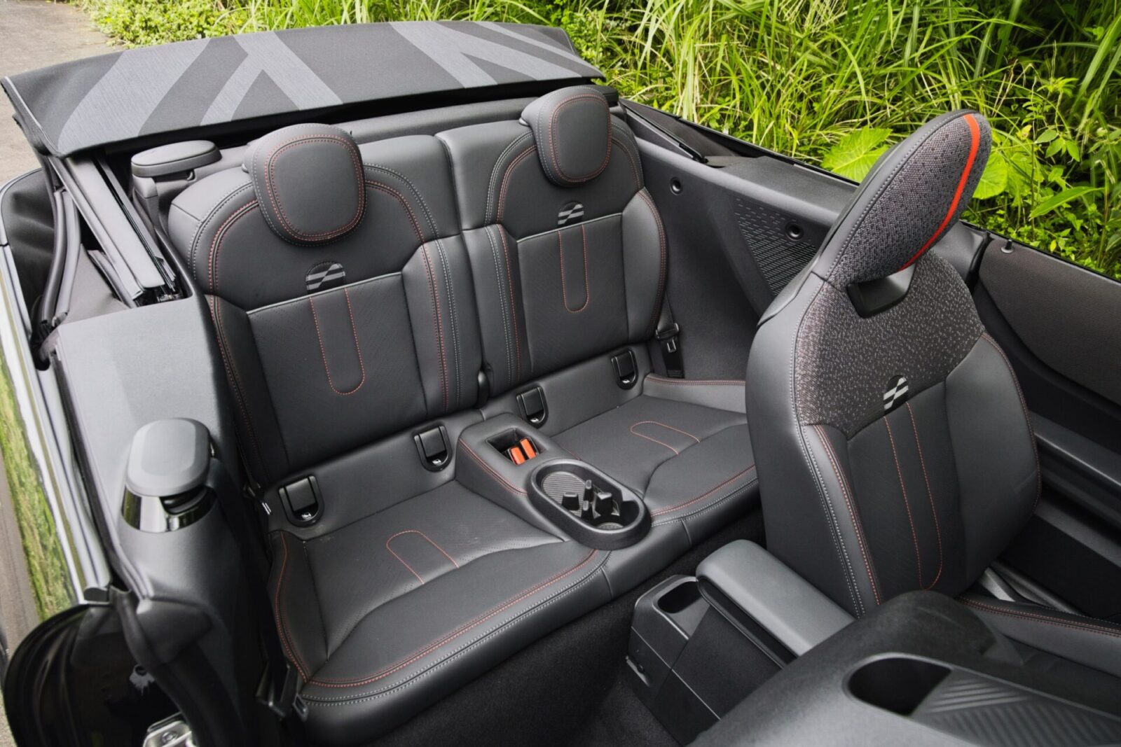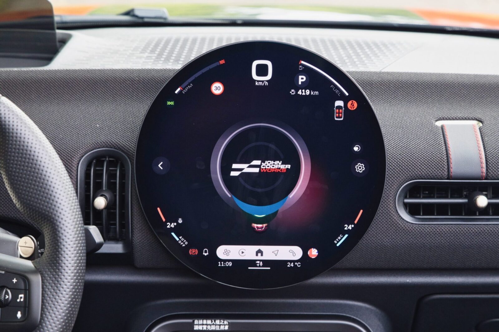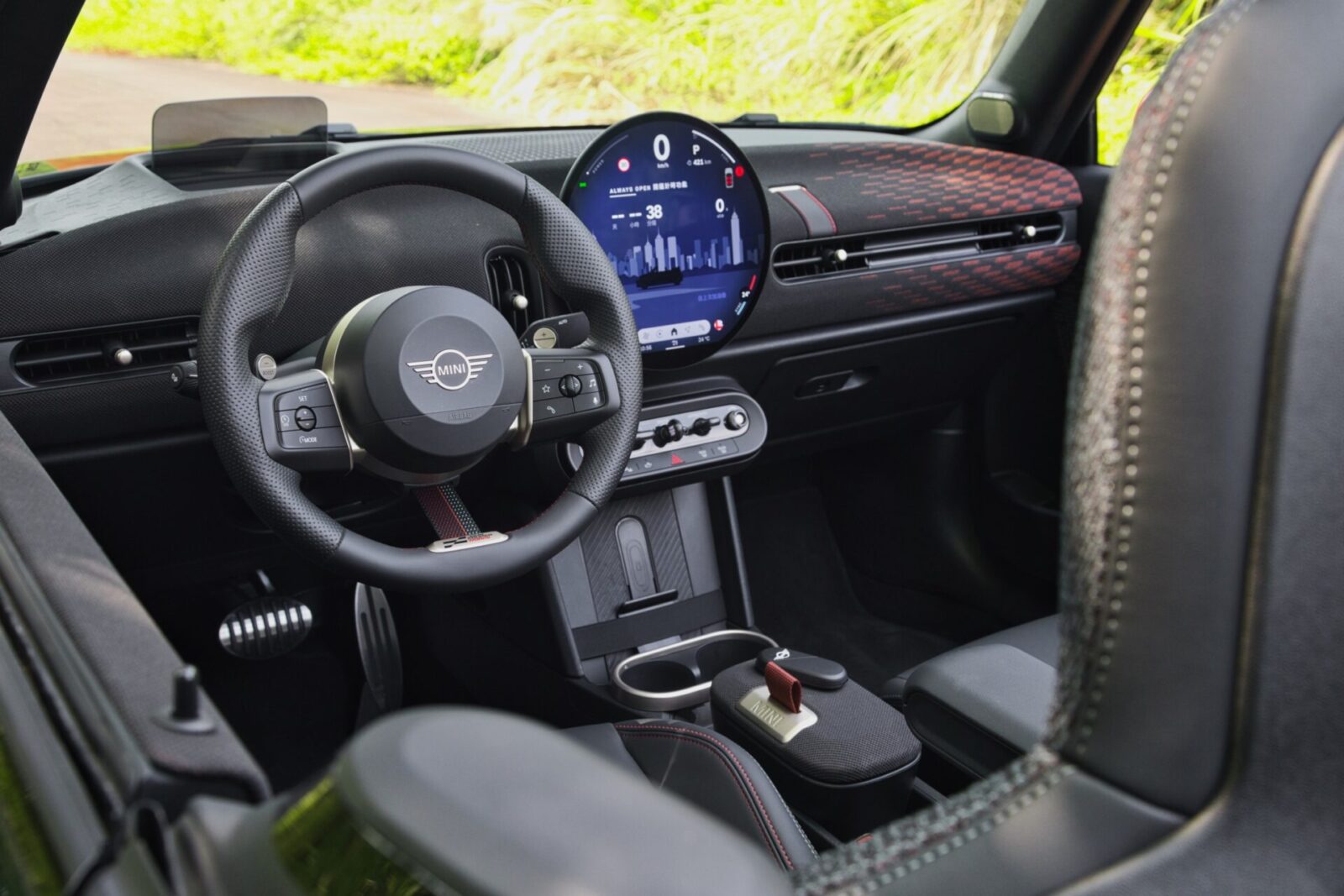 內裝部分延續三門掀背基礎,包括附有專屬銘牌與換檔撥片的JCW跑車式方向盤、採織布/皮質混搭與紅色縫線點綴的雙前座JCW賽車座椅,以及副駕處加入紅色方格旗圖樣的黑色織布面料控檯等配置全數保留,同時在圓形OLED螢幕中整合的Mini OS 9整合系統亦加入敞篷專屬的Always Open開篷計時功能,無論開篷馳騁的開心時刻或隨意切換的啟閉次數都在螢幕上一目瞭然;此外,即使身為高性能車款,本車依舊標配符合Level 2水準的ADAS駕駛輔助系統,長途行車時只要按下方向盤左側控鍵便能立即啟用ACC與主動車道維持輔助,還有結合12顆超音波感應器與4顆環視攝影鏡頭的全新自動停車輔助系統,在狹窄空間也能完成自動停車,帶來更為便利貼心的用車體驗。