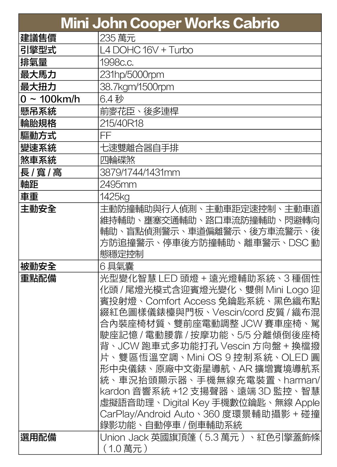 對於喜愛Mini玩樂風格的買家來說,JCW代表著熱血澎湃的操控快感、Cabrio代表著外放拉風的高調魅力,但既然大家都不是小孩子了,原廠自然也給出了「我全都要」的完美選項─Mini JCW Cabrio……