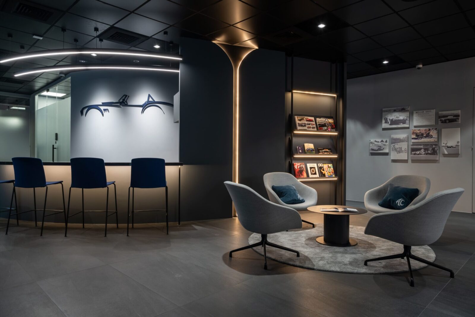 AC Cars展示中心定址敦南林蔭大道,空間採用大量弧形線條呼應品牌及車款特色,品牌歷史牆映入眼簾,一覽傳奇的誕生,藍色烤漆全碳纖維接待桌由原廠專屬碳纖維製造部門精心打造,別有風格及識別。吧檯設計結合牆上 Cobra車身線條的裝飾藝術,營造出舒適雅緻的氛圍,並提供各式飲品,讓賓客得以放鬆心情、自在享受。寬敞舒適的獨立車輛選配室,讓貴賓盡情發想獨一無二的車款,從外觀車色、內裝皮革與布料等各式搭配,亦可與原廠合作打造富有個人化特色的AC Cobra GT;此外,AC Cars Taiwan 整合汽車檢診區於展示空間內,以英國國旗為設計的檢修燈做為主視覺,採用飛行技師概念,由具備多年超豪華汽車品牌經驗的售後服務部主管,利用檢診區亦或是高雄協力廠區為客戶的愛車進行檢測、故障排除及維修保養。2年不限里程的原廠保固期間,總代理誠萬汽車更提供每年一次免費全罩式拖車運送服務,打造車主貴賓隱密且完善的售後維修體驗;未來,AC Cars 也將推出系列品牌精品,並同步引進台灣,從駕馭到生活,體驗獨有的英式風格細節。
