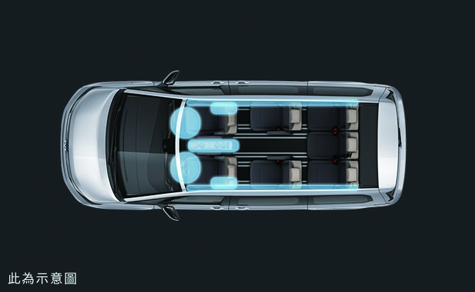 全新Multivan TDI行車安全再進化,全車系標配福斯家族最先進的「IQ.DRIVE智能駕駛輔助系統」,包含:Level 2智能駕駛輔助系統,搭載全速域ACC主動車距調節巡航系統、Side Assist 車側盲點警示系統、Lane Assist車道維持及偏移警示系統(含修正輔助功能)、Travel Assist智慧車陣穿梭系統、Emergency Assist 緊急待援輔助系統、Exit Warning 離車安全警示系統,以及停車輔助方面的RTA 後方橫向車流警示系統 (含煞車輔助功能) 、Park Assist 自動停車輔助系統等多項主動安全科技,即時提供駕駛者周圍車況,以最全面的智能駕駛輔助科技為每一位乘客的行車安全層層把關。此外,Multivan全車系同步標配七顆環艙安全氣囊,包含雙前座SRS氣囊、雙前座SRS側氣囊、雙前座+乘客艙SRS側氣簾,以及同級唯一的駕駛艙中央SRS氣囊,有效降低撞擊對前座乘員造成的傷害,全方位守護您與家人的每一趟旅程。
