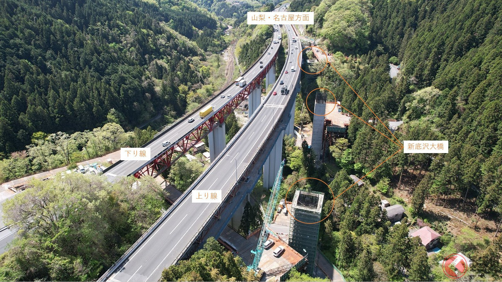 6月25日:山梨方向通往小仏隧道手前的「新底澤大橋」(暫名)完成3根橋腳建設。該橋為北側新增橋梁,用以連接本線與新隧道。其中最高的橋腳高達地面約50公尺,橋腳為中空結構。