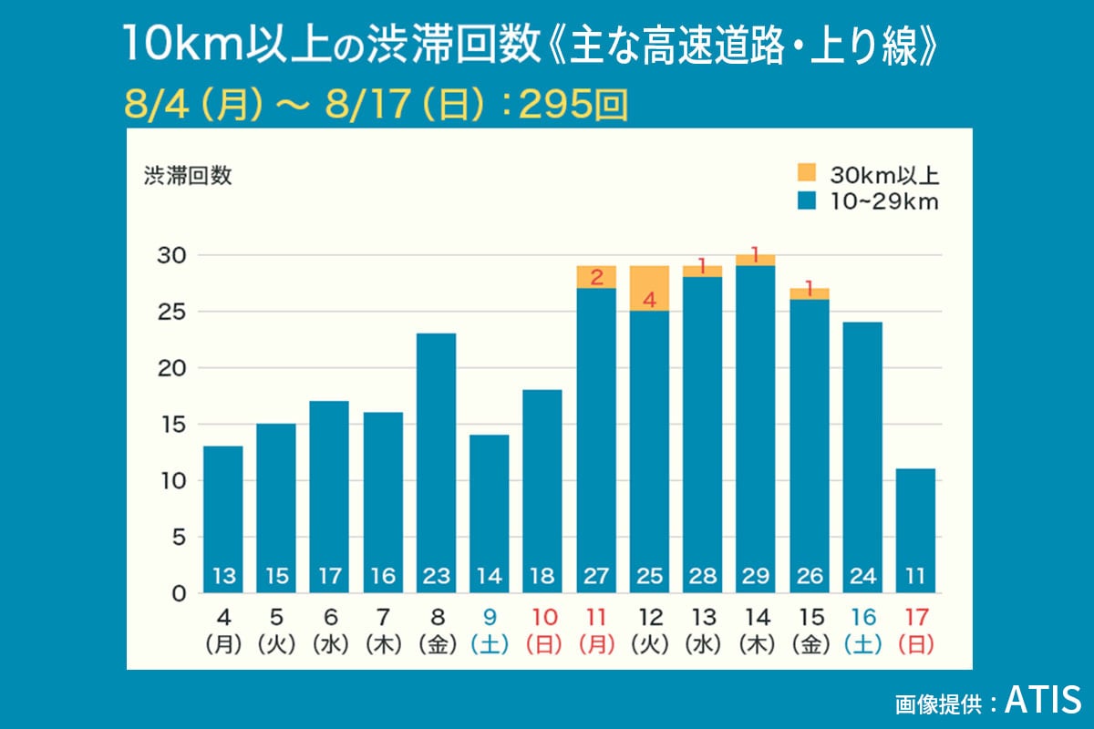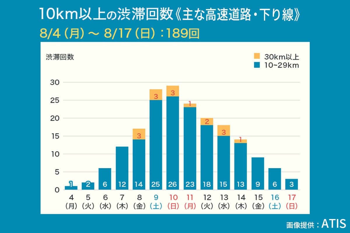 另外,預計在8月8日(星期五)至8月16日(星期六)期間,發生10公里以上壅塞的次數中,下行線有165次,上行線有223次,整體來看,返程方向的上行線壅塞日數可能較多。