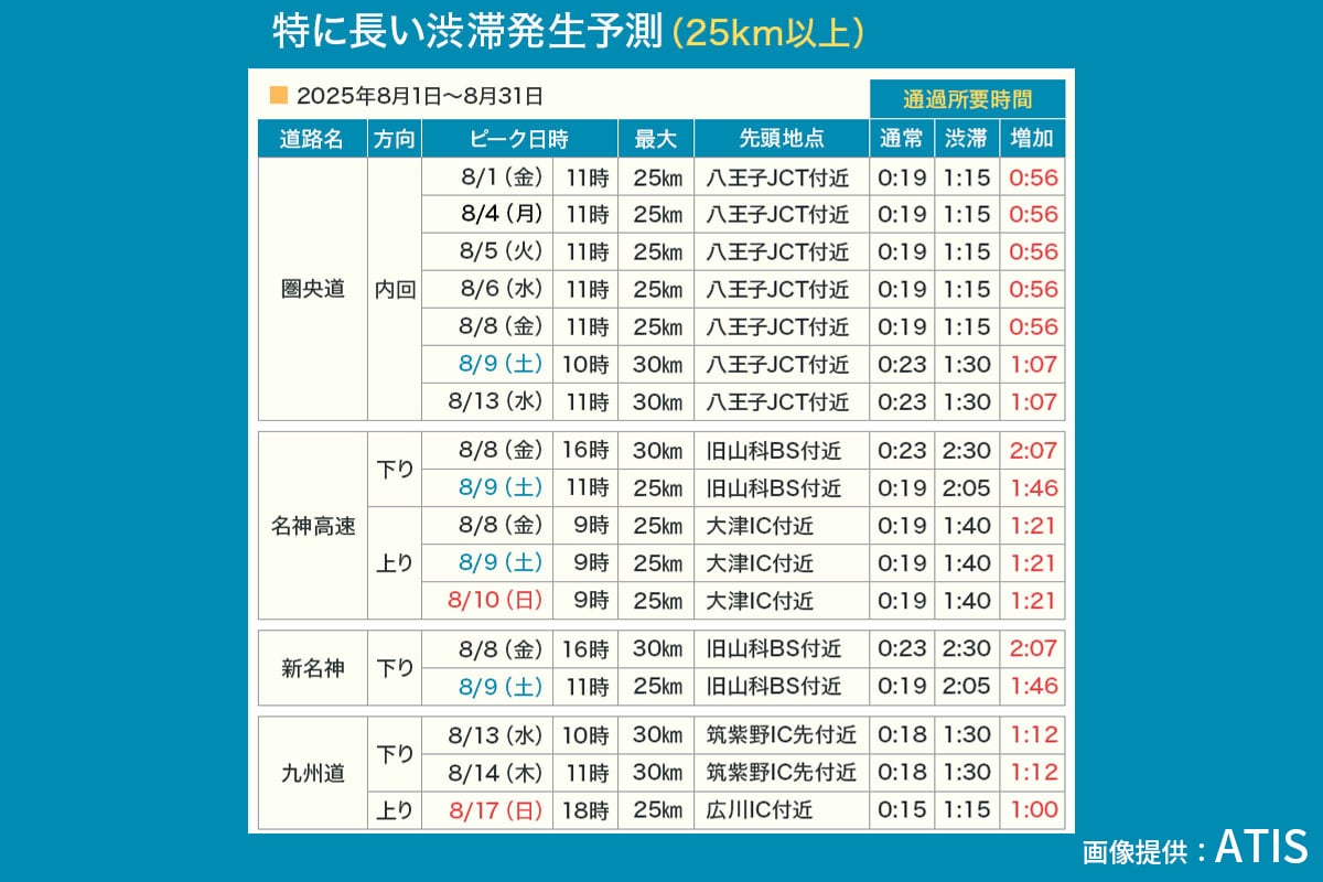 東名高速公路下行線預計在8月8日(星期五)至10日(星期日)上午,在秦野中井交流道附近出現最大約35公里的壅塞,新東名高速公路下行線則預測於8月9日(星期六)上午,在岡崎東交流道附近出現最大約25公里的壅塞。