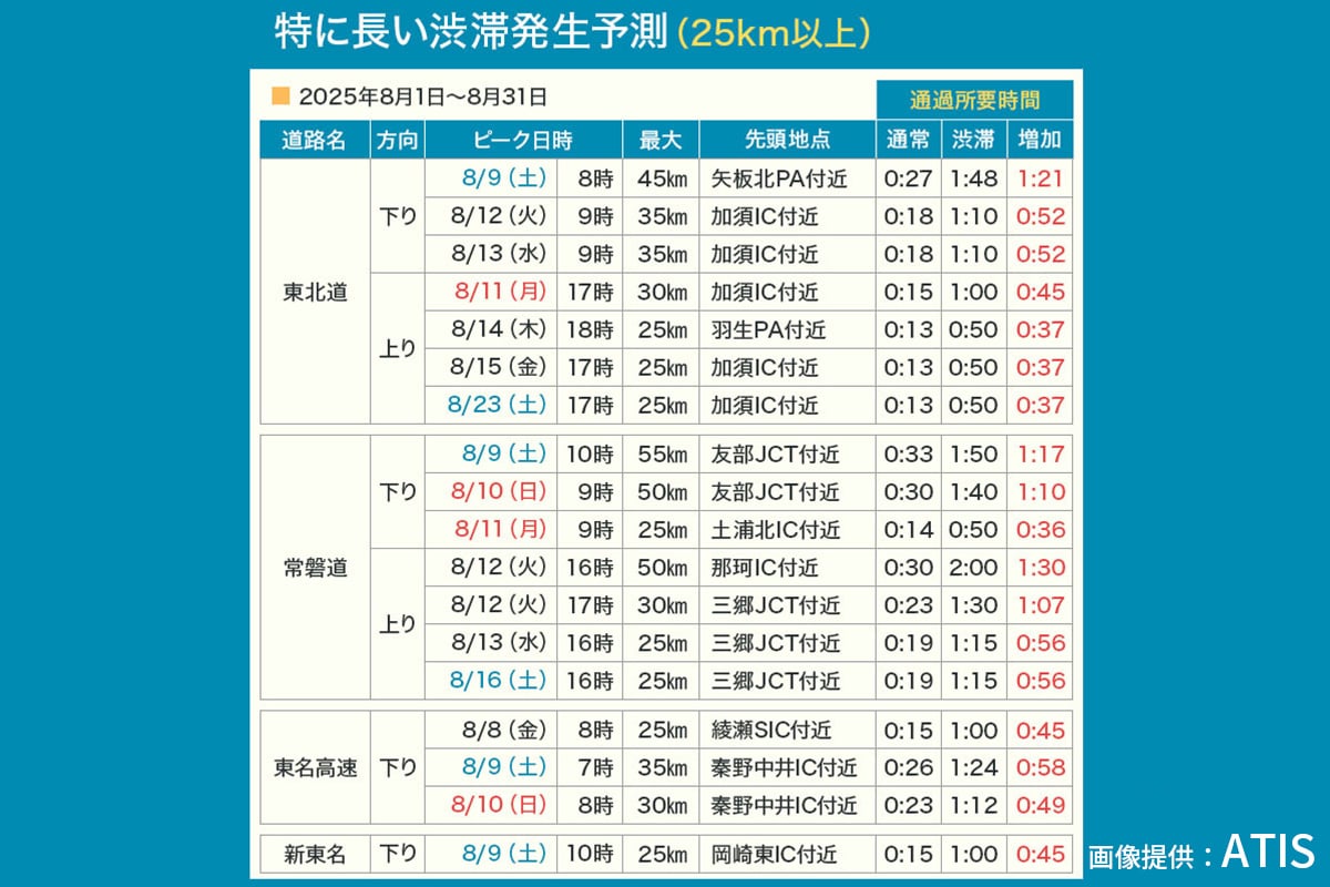 東北自動車道預計於8月9日(星期六)上午,在矢板北休息區附近下行方向出現最大約45公里的壅塞,8月11日(星期一,國定假日)傍晚在加須交流道附近上行方向則預測有最大約30公里的壅塞。
