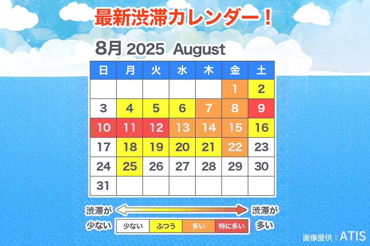 從「最新壅塞日曆」來看,相較於盂蘭盆節,8月下旬的壅塞預測會較少。因此,如果條件允許,將返鄉或旅行安排在暑假的後半段,也是避開壅塞的有效對策之一。