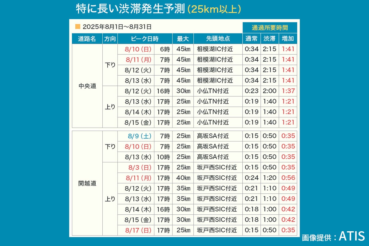 中央自動車道下行方向預計在8月10日(日)至13日(三)上午於相模湖交流道附近出現最大約45公里的壅塞;上行方向則在8月12日(二)傍晚於小仏隧道附近預測最大約30公里壅塞,13日(三)至15日(五)傍晚同一地點則預計有最大約25公里的壅塞。