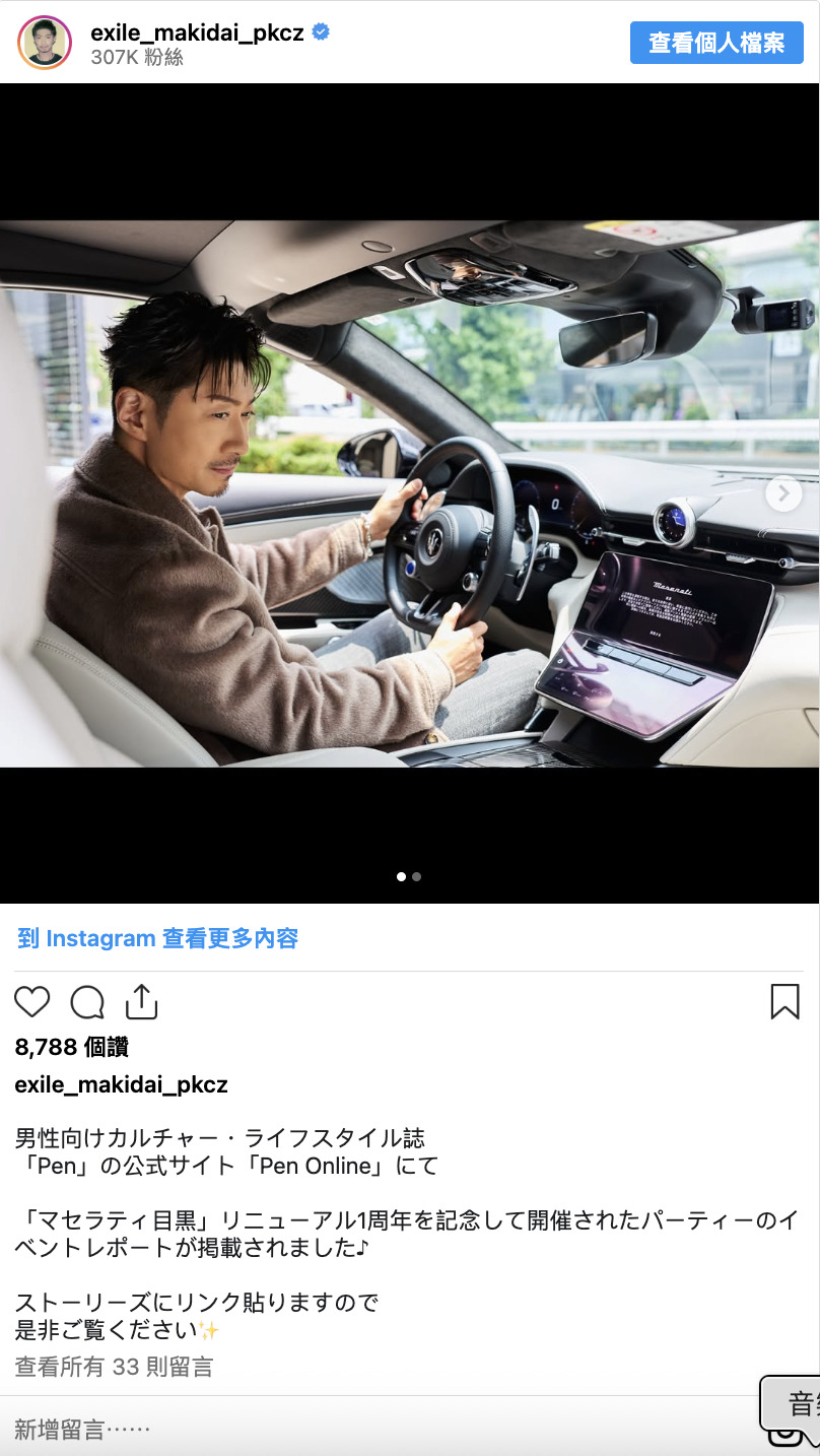 現在身兼演員與表演者的MAKIDAI更新了自己的Instagram,公開了與義大利高級車品牌「瑪莎拉蒂」新款車的合照。