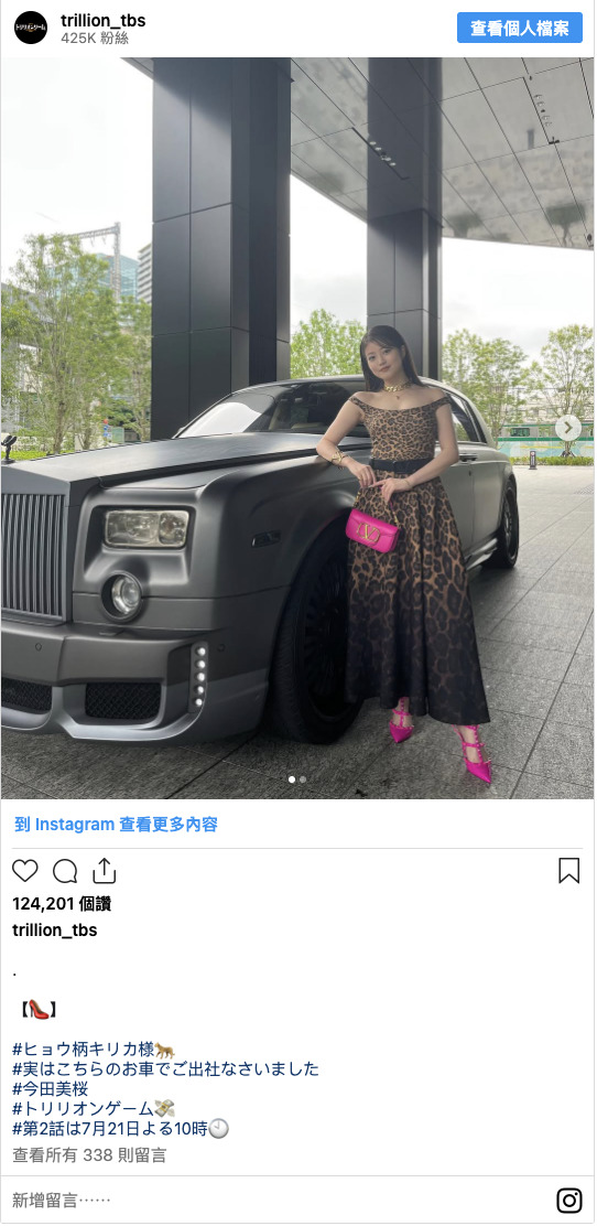 受到矚目的照片,是 2023 年 7 月 18 日由該劇官方 Instagram 公開的。照片中,身穿豹紋洋裝、腳踩亮粉紅高跟鞋,手拎包包的「霧花大人」,站在一台超高級車旁邊的身影被拍了下來。