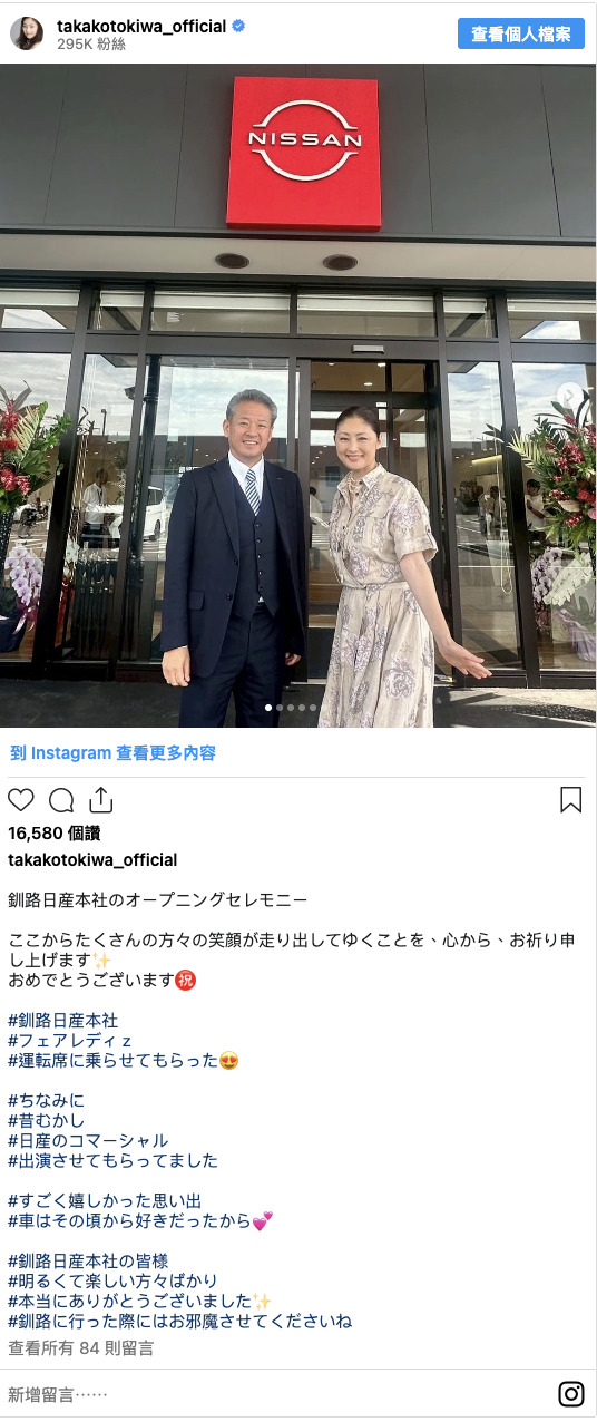 此外,她也在貼文中附上多個標籤與留言,例如「#フェアレディZ」「#坐上駕駛座」「#順便說一下」「#很久以前」「#日產的廣告」「#曾經參與過」「#非常開心的回憶」「#從那時起就喜歡車子」,回憶起 1990 年代後期曾出演日產「Bluebird(U14 型)」的廣告,以及自己對車子的熱愛。
