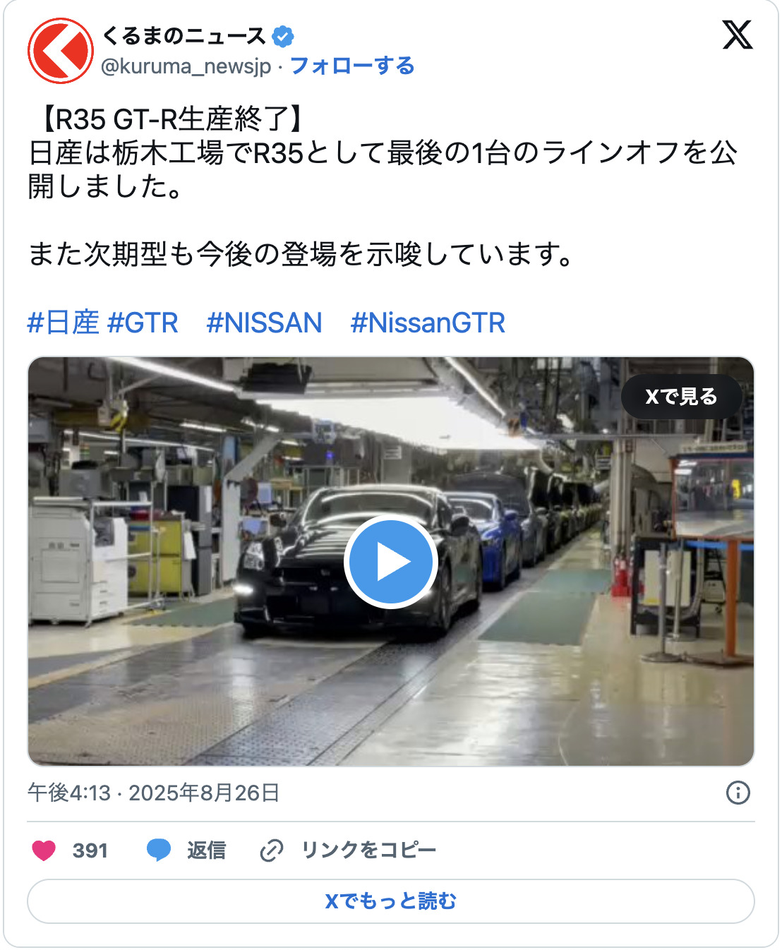 日產在2025年8月26日宣布,自2007年起生產長達18年的「GT-R(R35型)」正式停產,並在栃木工廠舉行了最終生產車的離線交車儀式。