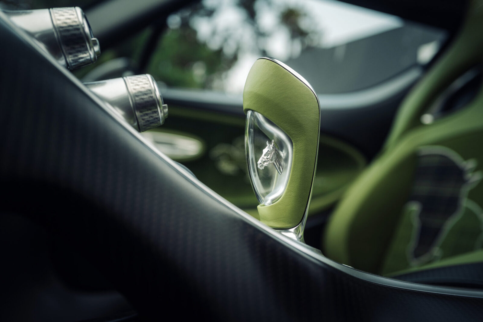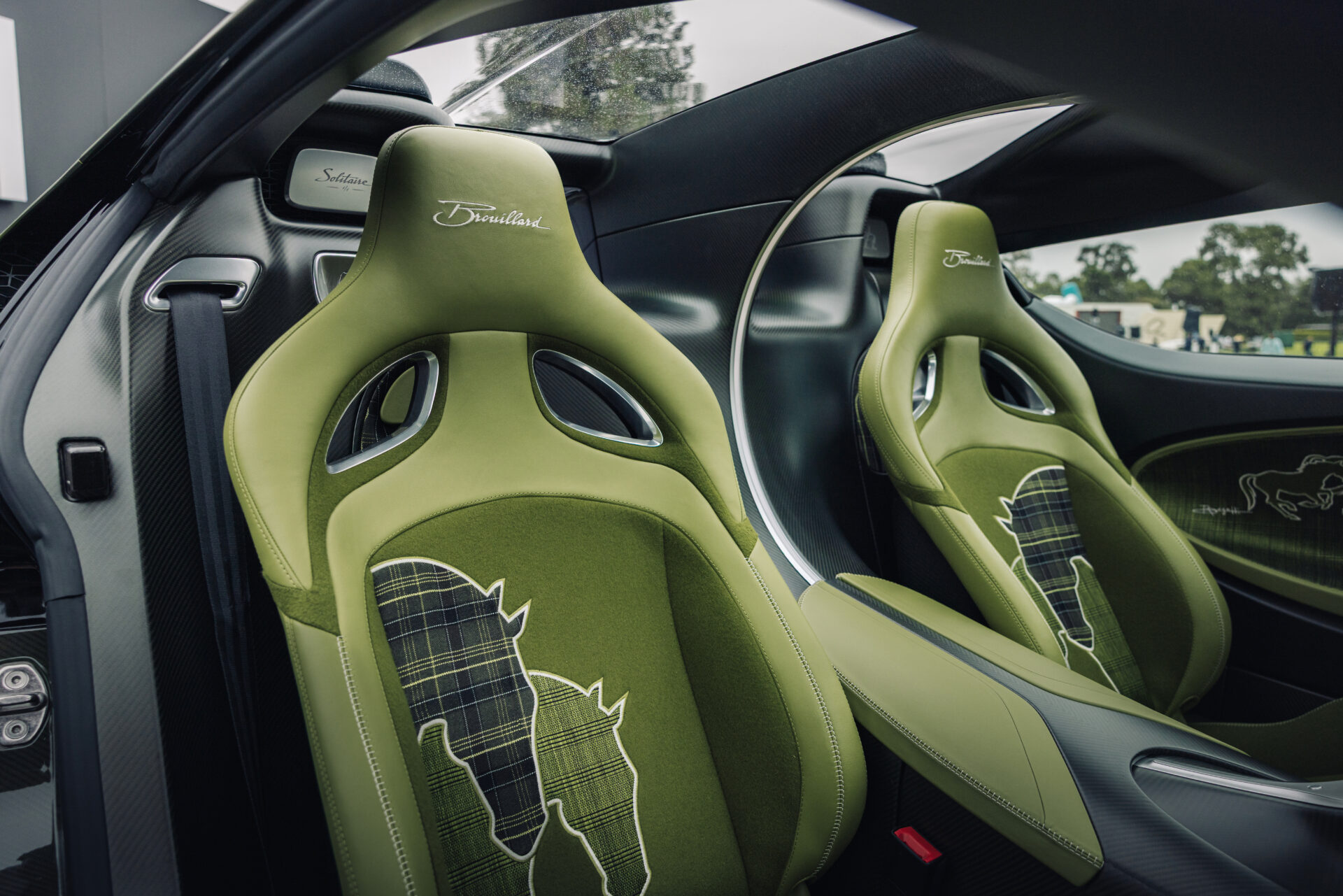 玻璃車頂讓座艙宛如大教堂般開闊,而車體中央脊線從外觀一路延伸到座艙,透過透明面板一覽無遺,而內裝細節更是讓人讚嘆,包括:車門與椅背繡上馬匹圖騰;座椅依車主需求量身訂做,皮革拼接獨一無二;排檔桿由整塊鋁材削製而成,內嵌水晶玻璃飾件,裡面是一尊微型手工雕刻的「Brouillard」馬雕像。這些巧思,讓Brouillard根本就像一套汽車高級訂製時裝。