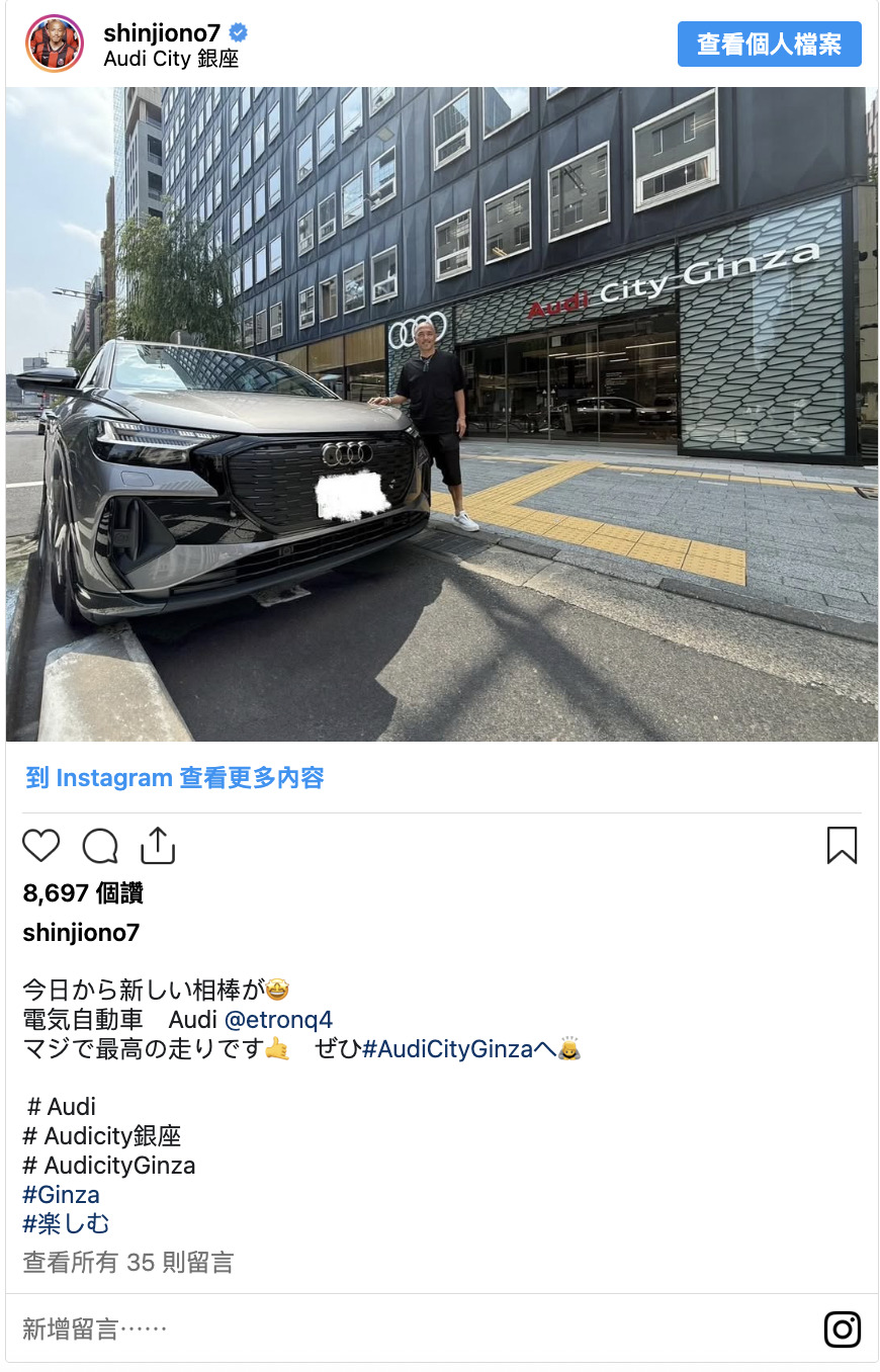 他在貼文中寫道:「從今天起,有了新的夥伴」,並留言:「電動車 Audi @etronq4,真的是最棒的駕駛感,大家一定要來 #AudiCityGinza 看看」。
