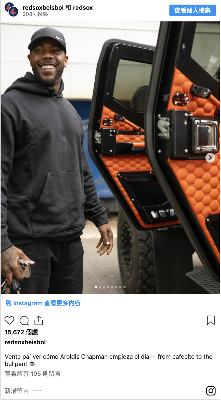 美國職棒大聯盟(MLB)波士頓紅襪隊的官方 Instagram 公開了投手 阿羅迪斯·查普曼(Aroldis Chapman) 的休閒生活照片。