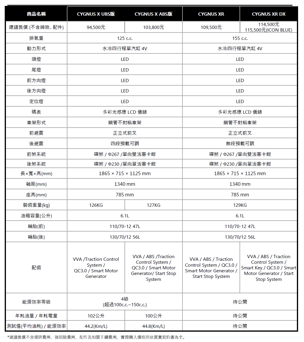 •設計美學:承繼「 CYGNUS 」家族外型設計語彙,車側閃電型飛鏢造型,同時結合俐落化車身設計,展現更輕盈的運動姿態。