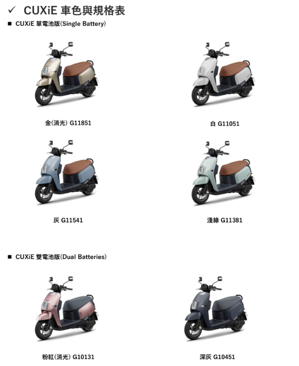 都會活力系(雙電池):共有粉紅(消光)、深灰2種顏色,並搭配防滑織布坐墊(深灰),結合舒適觸感與時尚層次。不論是日常通勤還是生活風格展演,全新純電「CUXiE」都將成為都會騎士最值得擁有的電動移動夥伴。