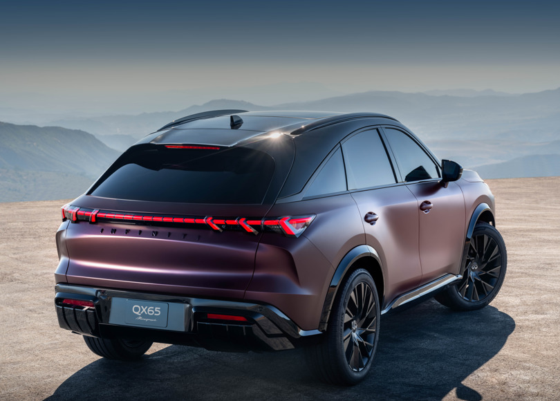 QX65 Monograph採用全新研發的Twilight消光變色塗裝,靈感來自日落黃昏時分的紅金交錯。隨著光影變化,車身表面能在紅紫與閃耀金色之間轉換,宛如夜幕降臨前的最後一道光芒。