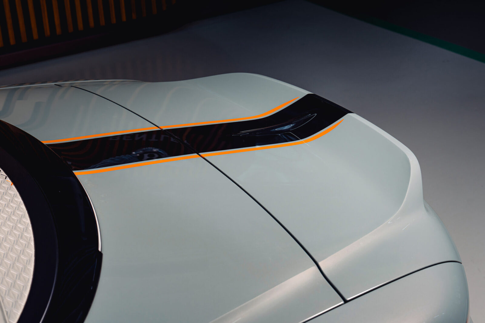 這部Batur Convertible以Opalite銀為主色,車身中央劃過一條Beluga黑色亮面賽車條紋,兩側輔以Mandarin橙色細線點綴,營造鮮明層次感。條紋從水箱護罩出發,延伸至引擎蓋、駕駛艙上方的「airbridge」,再一路延展到車尾甲板,最後於後行李廂蓋以同款圖案收尾作結。