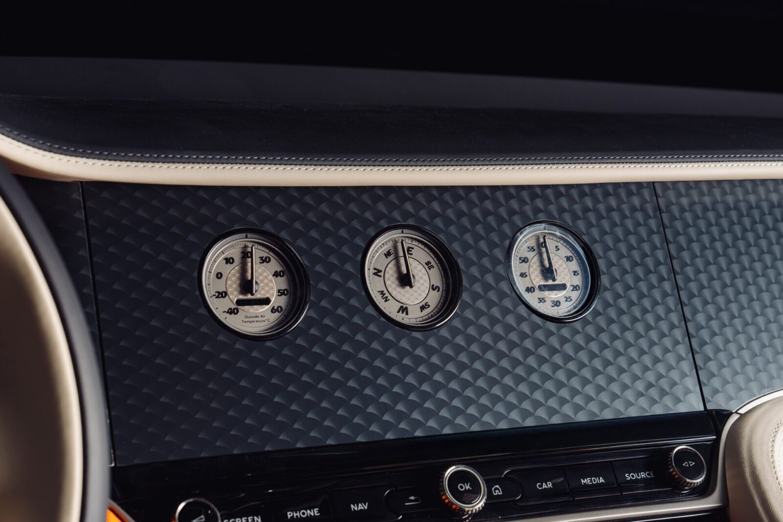 兩側以Mandarin橙色飾條作為視覺連結,既分明又協調。駕駛區配備專屬真皮方向盤、類碳纖維飾板與Mulliner手工縫製皮革;副駕區則以柔和色調與頂級皮革材質,營造優雅休旅氛圍。