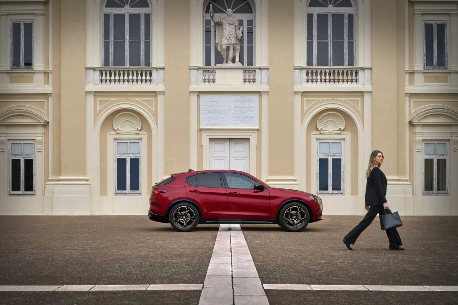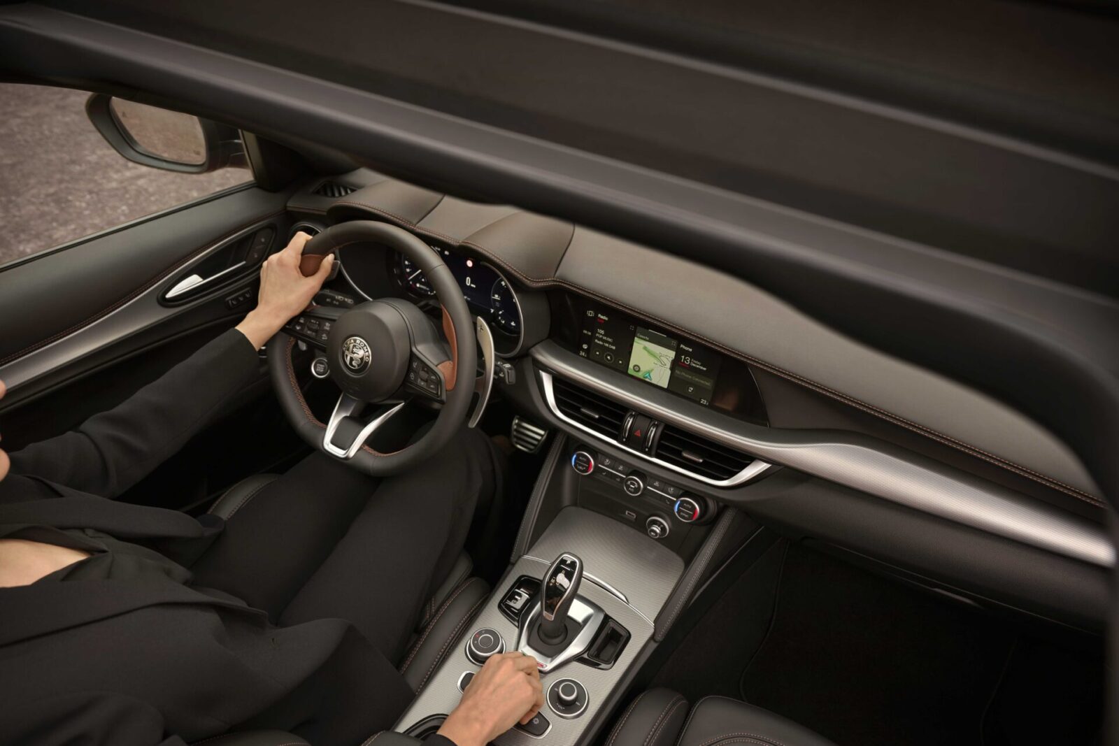在設計上,Giulia 與 Stelvio 承襲 Alfa Romeo 經典 Scudetto 盾型 V 字型蛇紋水箱護罩,搭配致敬 SZ Zagato 與 Proteo 概念車的三葉型 LED 主動式矩陣頭燈,塑造鮮明辨識度。車身比例遵循「完美平衡」原則,以短前懸、長引擎蓋與俐落曲線,展現義式設計的流暢美感。