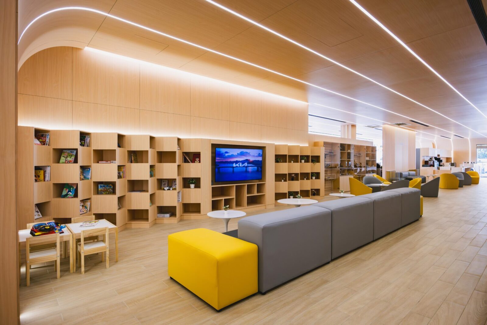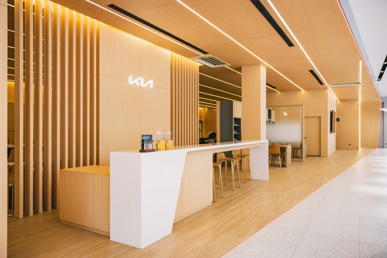 Kia森那美直營台北旗艦店內的設計靈感,來自於自然與人文的對話,外觀以簡潔大器的單色系勾勒,內部透過溫潤木質色調營造舒適氛圍,展現Kia 「Opposites United 對立的和諧」設計理念。整座基地面寬達54.7公尺、縱深47.6公尺、近800坪的廣闊空間:一樓展示區可同時展出9部新車,可將Kia全車系完整展示,包含電動車專屬的「EV Zone」,搭配Kia電動車採用的十大永續材質展示牆;同時規劃獨立洽談空間與尊榮VIP交車室,提供靜謐貼心的諮詢服務與賞車環境。展示區後方則設有寬敞客休空間,結合親子休憩區與書牆,提供人文、古典、藝術、財經等選書,並導入由專人提供的星巴克咖啡服務,享受愜意悠閒的Kia專屬時光。