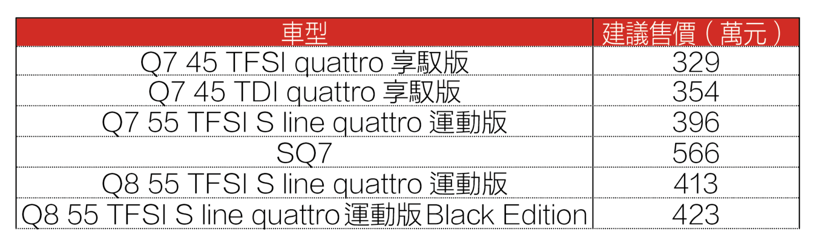 為持續提供豪華駕馭體驗,台灣奧迪於11月14日透過新聞稿宣布引進2026年式Audi Q7 & Q8車系,同步升級抬頭顯示器與動態全輪轉向系統。其中擔綱Q7車系入門代表的45 TFSI quattro享馭版小幅調漲4萬元,45 TDI quattro享馭版、55 TFSI S line quattro運動版,以及Q8車系均調漲7萬元,性能旗艦SQ7亦有6萬元的漲幅。