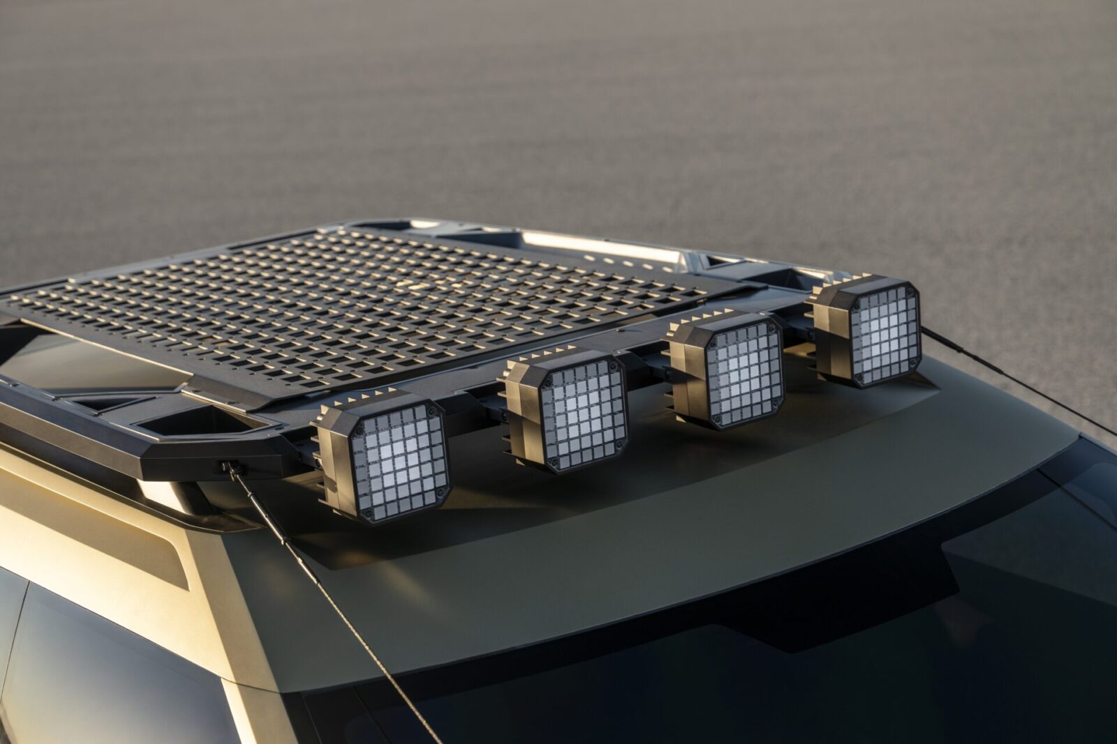 Crater Concept的車色名為 Dune Gold Matte,是受加州沿岸陽光、沙漠與金色荒野啟發的特殊霧面綠金色。在霧面光影的變化之中,車身折線呈現出層次與光澤的交錯效果,搭配橘色差異化點綴後,強化了整體的戶外冒險氣質。
