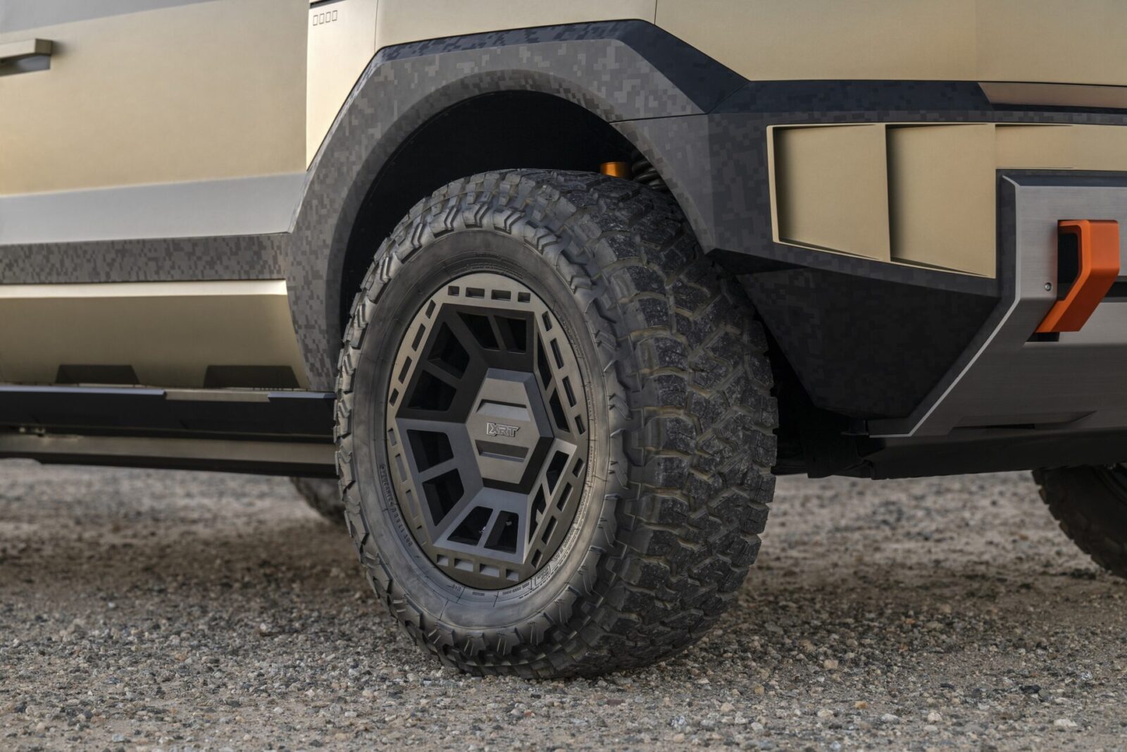 外型上,Crater Concept具備短前後懸設計、寬大輪拱與立體化鋼板防護件,整體比例緊湊但氣勢毫不收斂。18吋六角切面輪圈搭配33吋巨型越野胎,視覺上彷彿一顆撞擊大地的金屬隕石,其碎裂後形成的幾何面向刻劃在輪圈形體上。這組輪胎不僅強化通過性,也讓Crater Concept擁有最符合美式硬派越野的站姿。與輪胎相對應的是大面積金屬質感的防滑保護底板,面積橫跨車頭底部到腹部位置,像是一面保護車體的金屬盾牌,象徵功能性與造型語彙的合一。