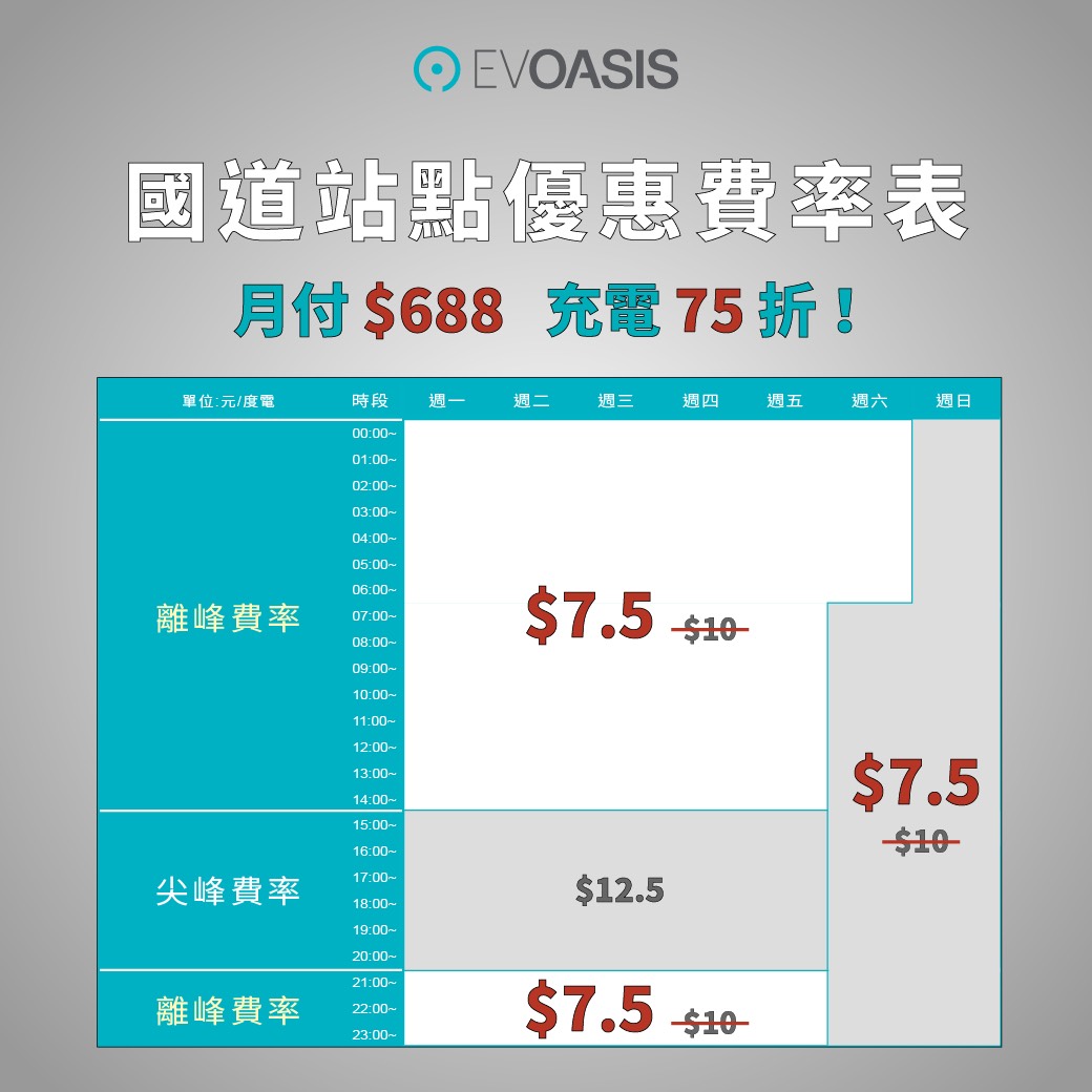 • 每月 $688,享 EVOASIS 指定 DC 站 充電費率 75 折