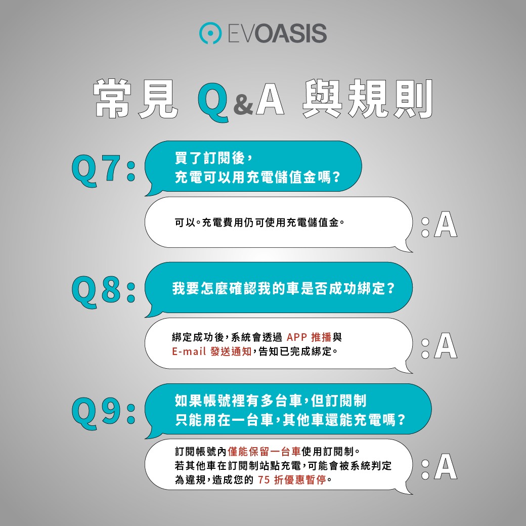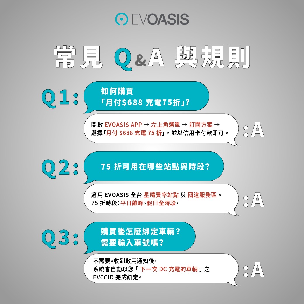 訂閱優惠不得與車廠充電優惠、新站上線優惠或其他未明確告知之官方活動重複使用,實際站點與費率以 EVOASIS APP 公告為準。
