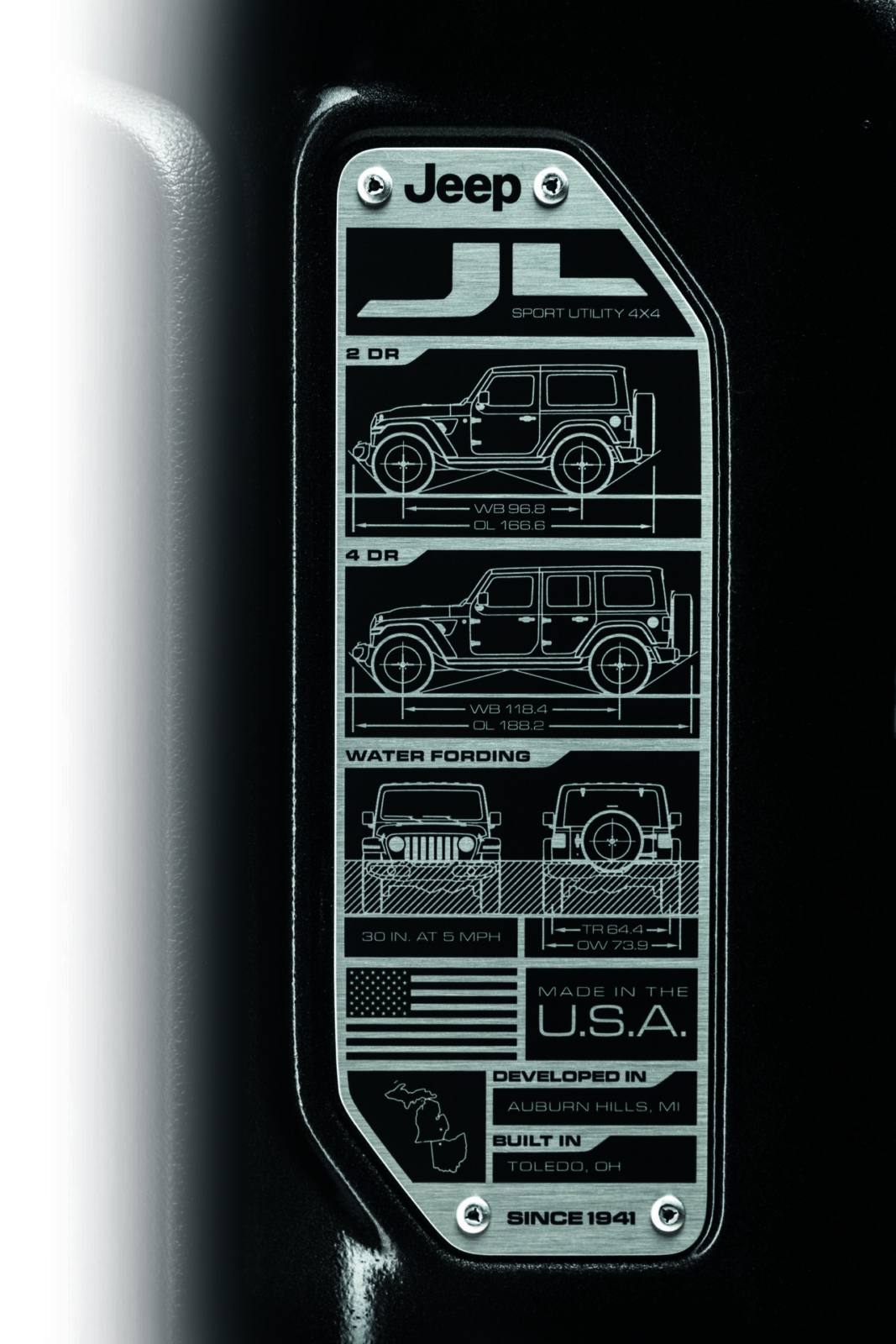 Jeep® Wrangler 的經典外型常被形容為「看起來就像吉普車」,然而更精準的說法是:Jeep® Wrangler 的造型本身,就是越野精神的具象化。其中最具代表性的七槽式格柵水箱護罩源自 Willys 在二戰奔赴七大洲的歷史足跡,而 Jeep® Wrangler 以暗灰色網格搭配金屬邊框重新演繹這項經典,同時透過格柵比例調整提升冷卻效率,使外觀美學與工程功能更緊密結合。