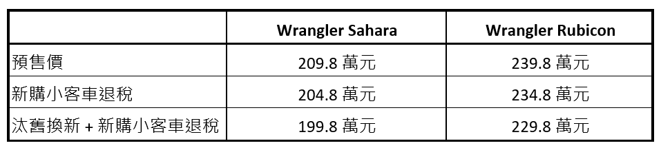 - Jeep® 總代理 寶嘉聯合乃在「美國進口關稅假設為 0%」之前提下訂定 Jeep® Wrangler 預售價格。後續若政府關稅政策或相關稅率公告有所變動,最終建議售價將以寶嘉聯合正式公告為準。