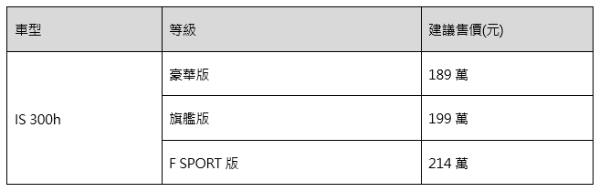 即日起IS 300h全新上市,在等級編成上提供豪華、旗艦及F SPORT共3個等級,售價自189萬元起。誠摯邀請您立即入主,親身蒞臨台北車展現場體驗IS魅惑跑格的風采,也歡迎造訪Lexus官方網站(http://www.lexus.com.tw)或致電顧客服務中心0800-036-036獲得更多IS車款相關資訊。