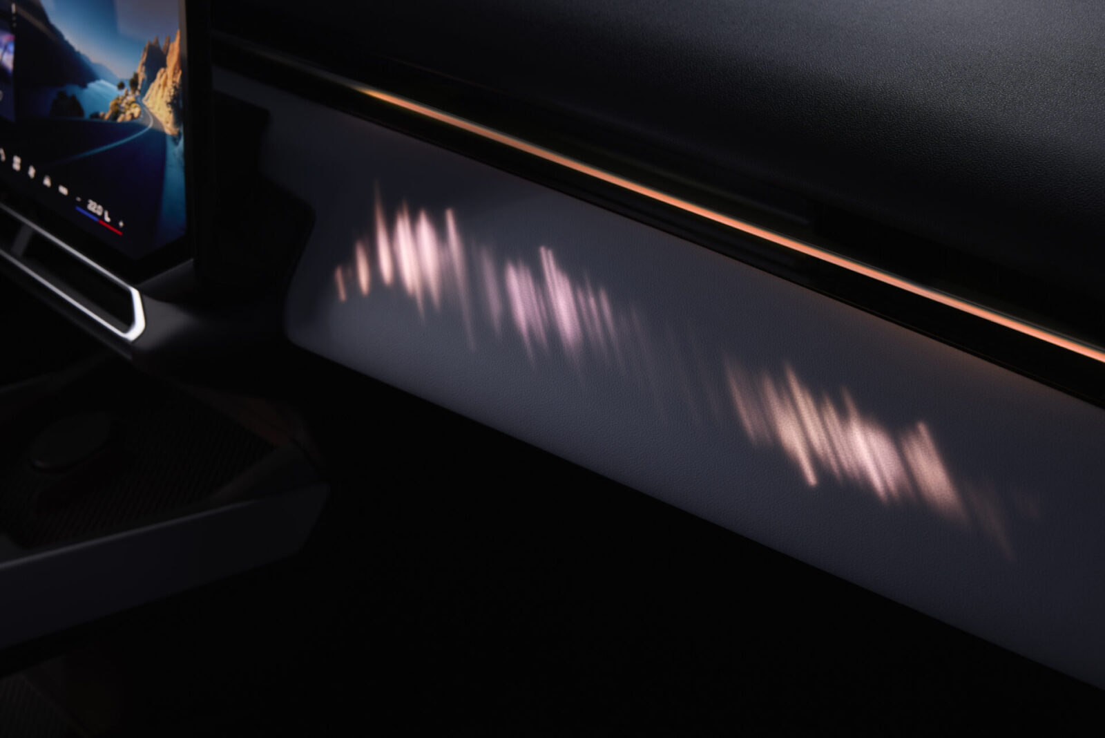 內裝與iX3同樣採用全新Panoramic iDrive設計理念,結合前擋風玻璃底下的Panoramic Vision全景數位儀錶、原廠稱為自由裁切造型的17.9吋中央觸控螢幕、將資訊投射至駕駛人前方視野的3D抬頭顯示器,以及結合觸覺回饋與隱藏式背光的shy-tech多功能方向盤。此外,全新i3車室鋪陳更加強調由控檯底部延伸至兩側車門上的環抱線條,副駕處更整合投影式的動態氛圍照明設計,可配合不同行車模式帶來繽紛多樣的色彩光影效果。