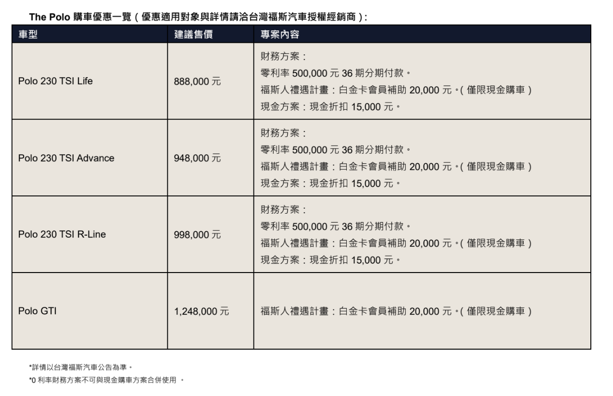 – 台灣福斯汽車同步推出多重優惠方案,包含現金購車方案現金折扣15,000 元、政府汰舊換新減徵貨物稅最高 10 萬元,以及福斯人禮遇計畫白金卡會員現金購車補助 20,000 元等,最低 75.3 萬元起即可入主The Polo,輕鬆體驗德系都會小掀背所帶來的靈巧操控與科技質感。