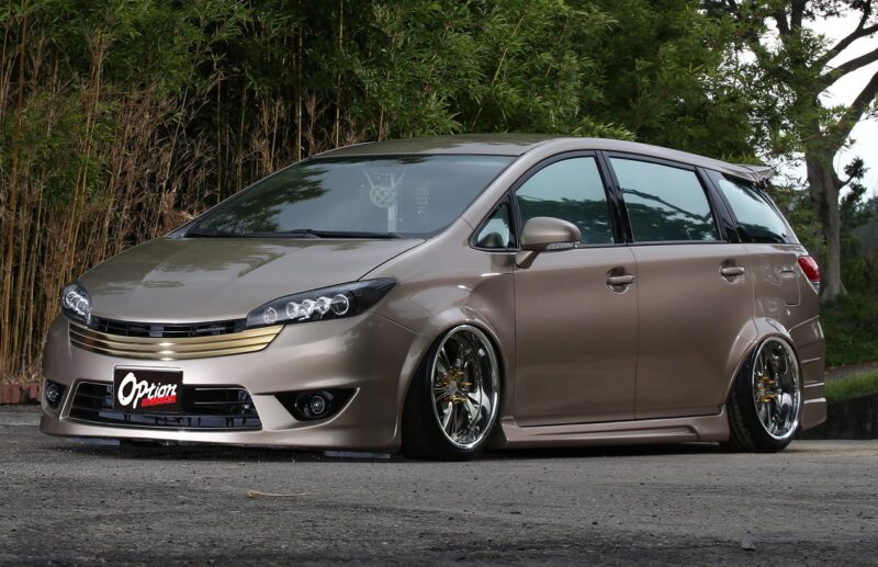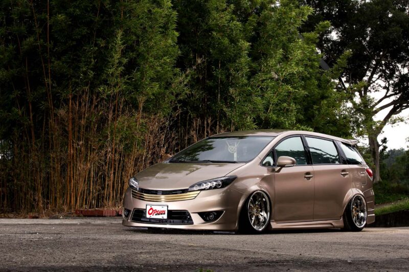 [影音介紹] 屌到爆的日系VIP Wish 寬體金色希望號前保桿採用日規Aero Tourer的套件,能讓車頭更加流線有型,而下方中央大型進氣壩,又能補強運動性格的特質,讓車頭扮相有如高速子彈列車般的動態感。車尾則是以S版後保桿+Modellista後下巴的組合來進行改造,透過向下延伸的方式,來展現車尾厚實的VIP風格