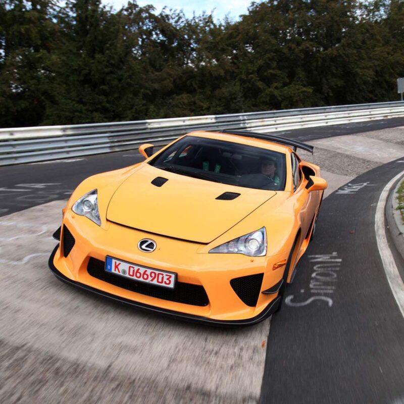 Lexus LFA Nurburgring Package7分14.64秒正如其名,這是專為紐柏林賽道推出的套件,由於LFA僅限量推出500輛的緣故,因此Nurburgring Package採用限量50套的方式。外觀部分大量運用碳纖維材料,像是前下擾流板、兩側