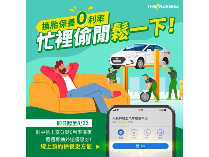 馳加愛爸爸 加碼慶88 領先業界導入inline預約功能,換胎保養更簡便 刷中信卡再享3、6分期零利率一年一度的父親節即將到來,身為新世代的駕駛爸爸們,除了要在忙碌工作及家庭關係中取得平衡,也必須思考怎麼做才是照顧寶貝愛車最省時便利的方法,而馳加率先導入的inline 預約功能,就是要滿足駕駛人快速保養的需求。