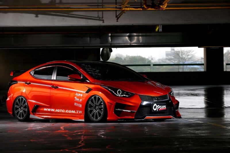 韓系戰機 JGTC Elantra X Kit從外型來看,Elantra具有著鮮明的新世代Hyundai家族風貌,無論是引擎蓋上的鈑件摺線,六角形進氣口造型、後掠式的鷹眼頭燈、自燈眉向車側延伸的高挑腰線,及充滿肌力感的外擴式