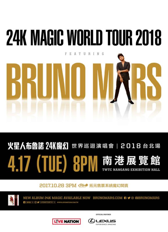 LEXUS獨家贊助Bruno Mars演唱會太熱門 無法加場 多關注官方贈票活動入圍全美音樂獎八項成為入圍最大贏家的火星人布魯諾(Bruno Mars)將在明年四月來台開唱,近兩萬張門票一開賣即秒殺!LEXUS將以官方合作夥伴身份,獨家贊助《Bruno Mars 24K魔幻世界巡迴演唱會2018台北場》,並安排L