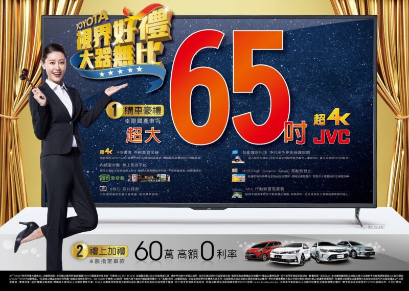 TOYOTA 視界好禮 大器無比專案 本月交車就送65吋超4K電視年末感恩促銷回饋,買車趁現在!TOYOTA台灣總代理和泰汽車,於本月加碼推出「TOYOTA視界好禮 大器無比」優惠活動,入主即贈超大65吋超4K JVC,現在買車超划算!