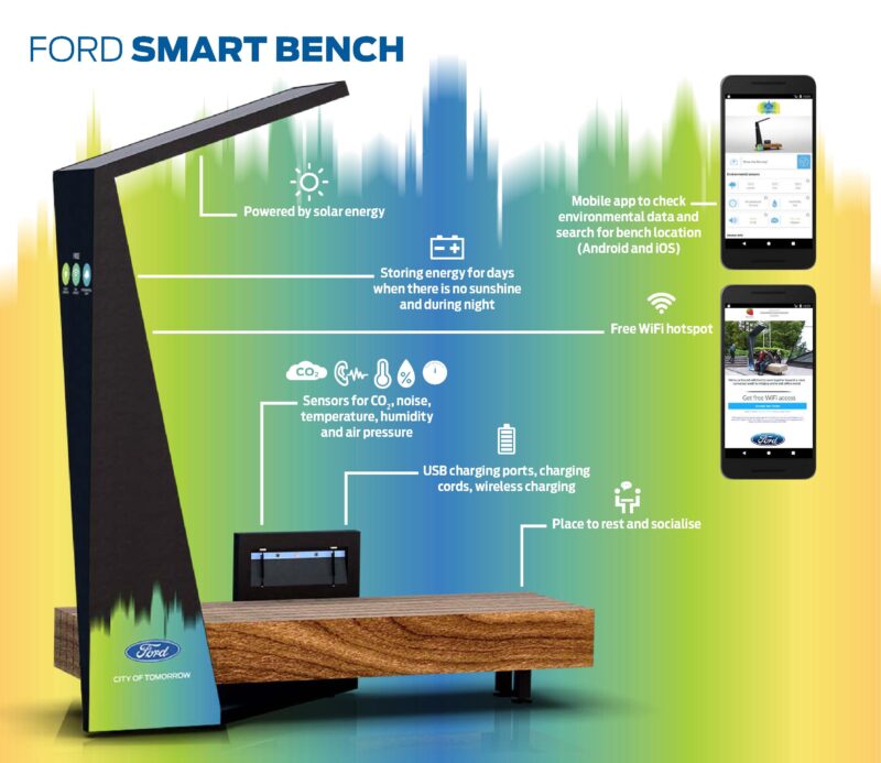 行充可以丟掉了,街頭長椅就可充電,還有Wi-Fi聯網服務Ford與智慧城市新創公司-Strawberry Energy正在建置智慧長椅-以太陽能Wi-Fi充電站為概念,為行人在城市中休憩時提供免費的太陽能手機充電功能和Wi-Fi服務。目前,在倫敦某些地區的行人將不必再擔心手機電池沒電,甚至連隨身電源也可能不需要