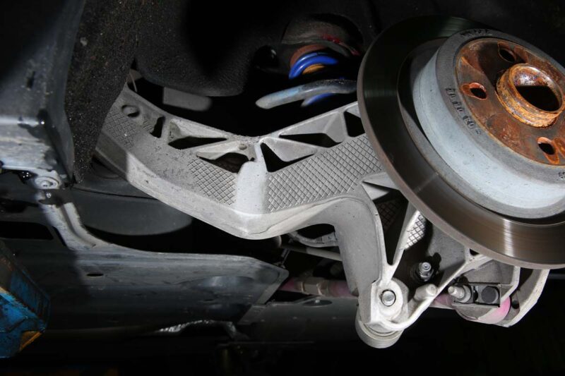 後搖臂(牛腿) Mini F56 Cooper S新基因後搖臂(俗稱:牛腿)在R53時期為鑄鐵材質,雖然重量較重、反應較為遲鈍,卻是耐用十足,一直到R53 John Cooper Works GP車型,才改為可達成輕量化訴求的鋁合金材質(R53可流用),而R56更將鋁合金牛腿列為標準配備,不過是F56