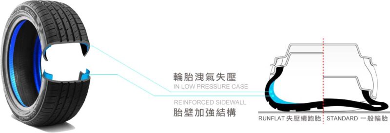何謂「RFT」可以不用空氣一直跑下去嗎?失壓續跑胎學名為「Run-Flat-Tire」,照字面翻譯有點愚蠢「跑-持續-輪胎」,也就是讓讓輪胎持續滾動的意思,因此無論任何品牌的失壓續跑胎通通歸類為「RFT」。