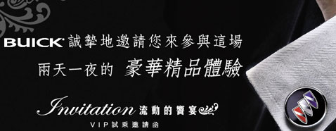 Buick與中國信託合作舉辦兩天一夜免費試乘活動,民眾只要在十月底前至Buick官網(www. Buick.com.tw)預約就能馬上體驗LaCrosse及Excelle兩款車型,而消費者只要申辦中國信託信用卡,並於明年二月底前單筆消費滿500元更有機會抽中Excelle,敬請把握機會!