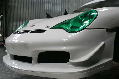 | 為了強化散熱與下擾流所需,Porsche 996 GT3 Cup直接在前保桿新增氣流導孔並融合定風翼。 |