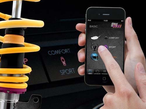 隨著電子與科技化之賜,日常生活之中大大小小雜事都免不了要e化,這回擅長懸吊套件開發的KW特別針對VW Golf 6推出全新DDC ECU高低軟硬可調懸吊,藉由電子可調阻尼器提供舒適、運動與加強版等三種阻尼模式,不過看似相當平常的電子可調懸吊為了能夠搭上近期所流行的「i」風潮,KW特別提供i Phone、i Pod與i Pad專屬應用程式,藉由W-LAN模組訊號傳輸以有效進行懸吊控制。
