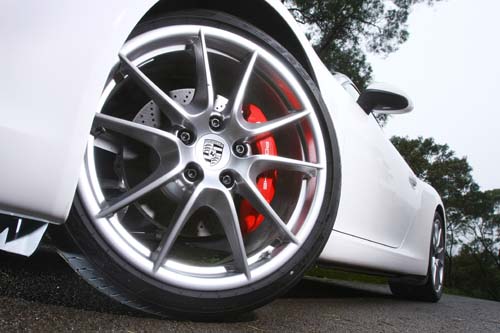 | 20吋輪圈是911 Carrera S的標準配備,紅色的煞車卡鉗代表它是傳統煞車,選配的PCCB陶瓷煞車則會換上黃色的卡鉗塗裝。 |