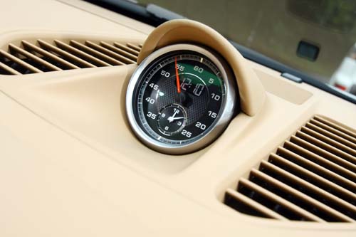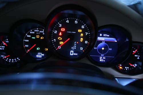 | 五環錶是911的經典設計,注意右側第二具儀錶已經被改為液晶顯示幕,圖中的顯示的是車身G值。 |