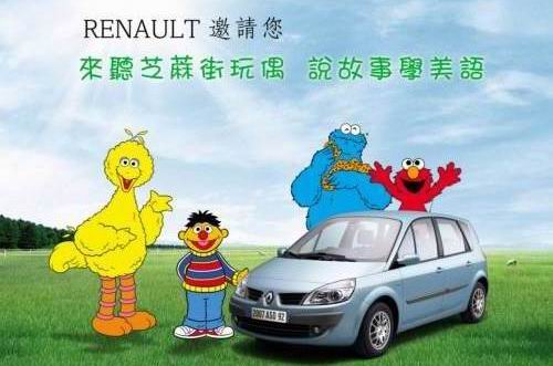 Renault汽車特芝蔴街兒童美語合作,於10月6、7日(六‧日),在Renault台北新店、新竹、台中、高雄展示中心,舉辦「來聽芝蔴街玩偶說故事學美語」活動,現場更有芝蔴街知名玩偶─大鳥姐姐(Big bird)、搔癢娃娃艾蒙(Elmo)等與小朋友一起同樂,並有機會獲得芝蔴街熱門商品。活動採預約報名,名額有限,額滿為止,請不要錯過與小朋友一起歡樂學美語的機會喔!