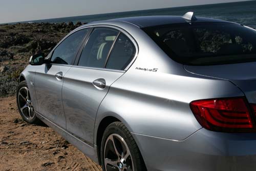 如果不說,實在很難看出這部5系列房車的獨特之處;仔細打量外觀,BMW並未因Hybrid動力系統而給予特別待遇,前後保桿與外型均維持既有的模樣,除了C柱與尾廂上頭的ActiveHybrid 5徽飾之外,就只有專屬的銀色前水箱護罩與輪圈款式,內裝也只加了一塊刻有ActiveHybrid 5字樣的金屬銘牌,其它則完全相同,整體可供辨識之處並不多。當然,不遠千里飛到歐洲大陸的最西端,面對的卻是如此內斂的一部5系列,一開始不免讓人有些失落,不過隨著Start鈕按下,車上所有功能隨著電力啟動而正常運轉,它用獨特的輕盈步伐引領我們進入電力與引擎完美融合的世界。